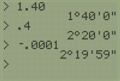 Do NOT use the + or - buttons to perform arithmetic like 1.5+0.5 as it will perform the addition prior to being converted from D.MMSS and give you the wrong result!